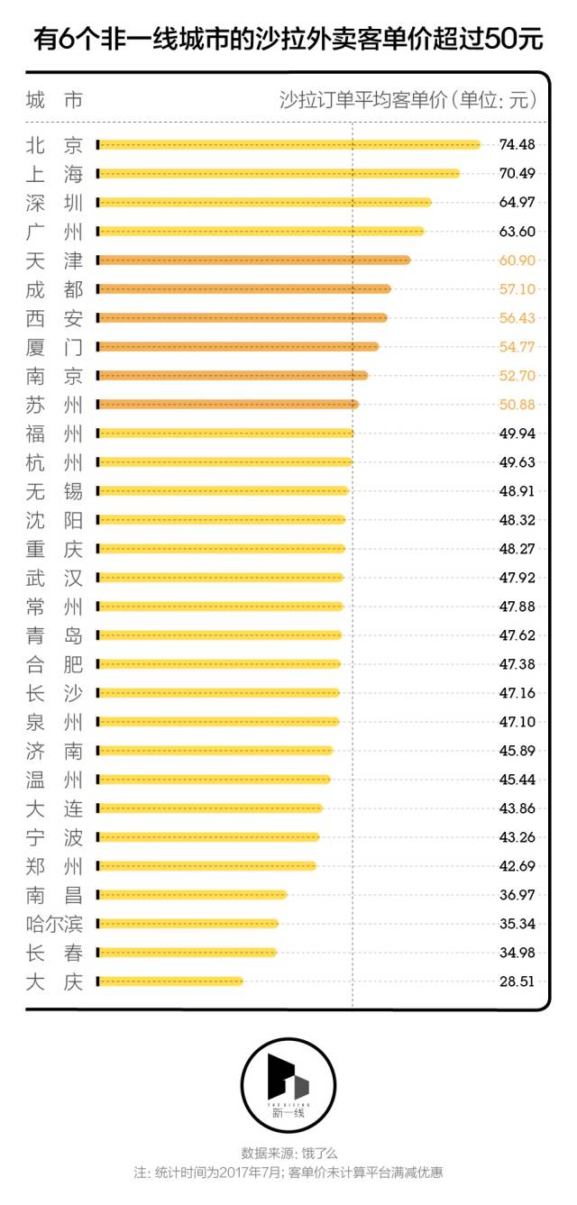 新一酱问饿了么拿来了一份数据,在饿了么平台今年8月沙拉外卖订单量最大的30个城市中,天津、成都、西安、厦门等10个城市的沙拉订单平均标价超过了50元,杭州和福州最接近30个城市的平均水平49.78元,这相比两年前有了12.95元的提高。
