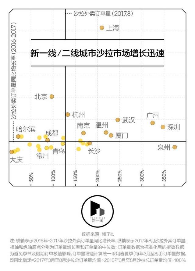 而在新一线和二线城市中,杭州、武汉、温州、南京和厦门等东南部城市的沙拉订单量年增速在134%至246%之间,郑洲、西安等北方城市的这个数字则普遍低于7成。在非一线城市,吃沙拉人数高速增长的主力,仍然是像付岩一样有健身需求、复购率极高的早期核心人群。