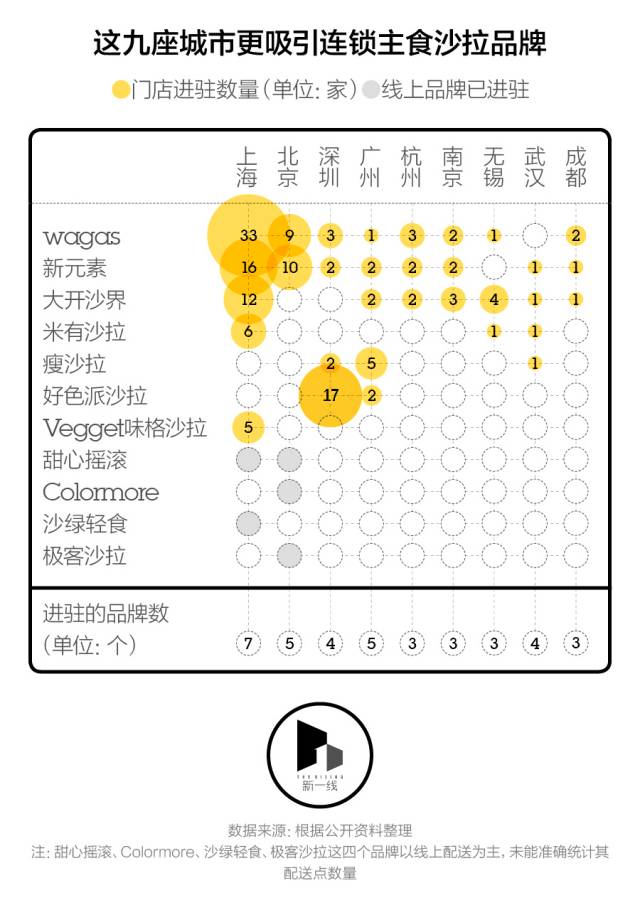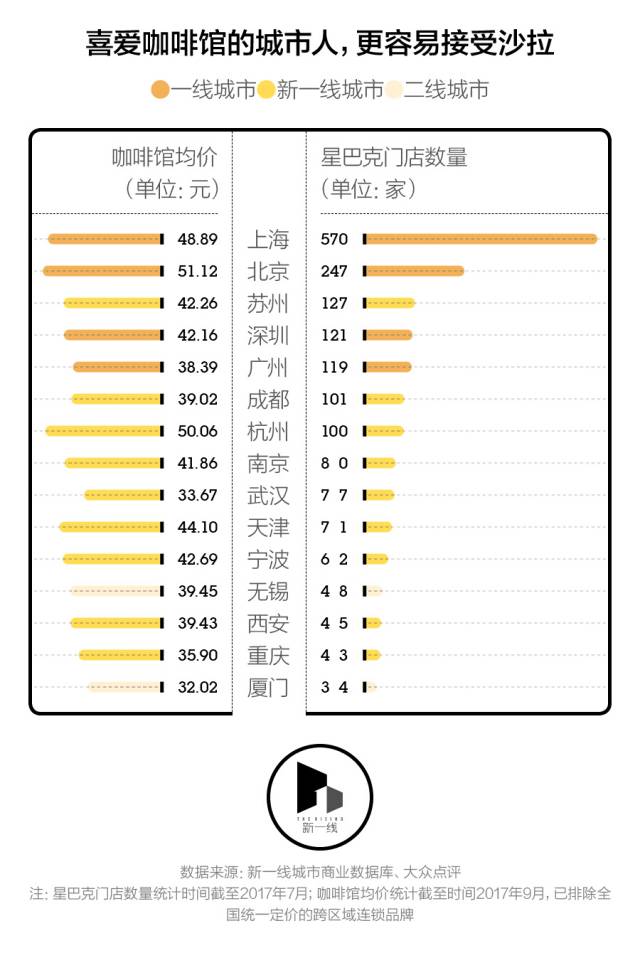 大开沙界的联合创始人肖羽觉得,沙拉品牌是否能开进一个城市,除了参考健身房数量,星巴克的数量也是一个很好的参照物。“我们认为,沙拉门店进驻的安全线是跟星巴克的密度保持在1:4以下。如果一个城市只有一两家星巴克,它就可能还没有做好接受大开沙界的准备,而要是有超过4家星巴克的话开进去应该是比较安全的了。”在中国内地星巴克已进驻的128个城市中,共有73个进驻数量达到4家以上。