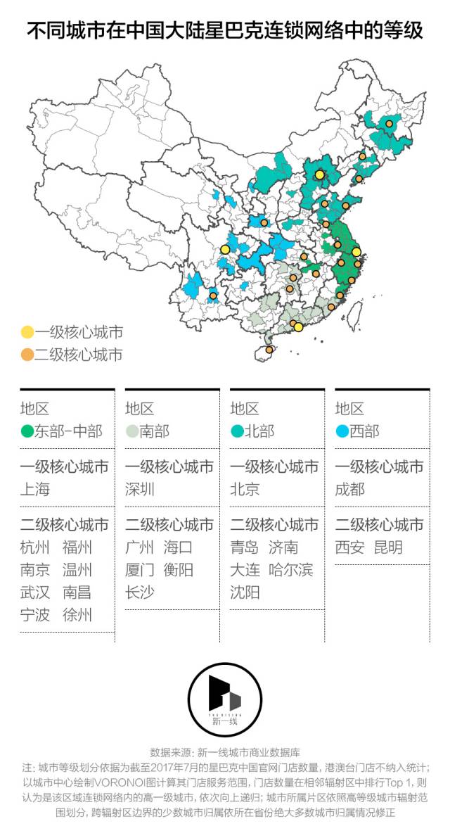 星巴克在内地的门店网络被北上深成都四大区分而治之(苏州、重庆因与上海、成都势力范围相邻,按照算法区域内重要性会被认为较低),它们分别是星巴克1999年至2005年间进入华北、华东、华南、华西的第一个城市。