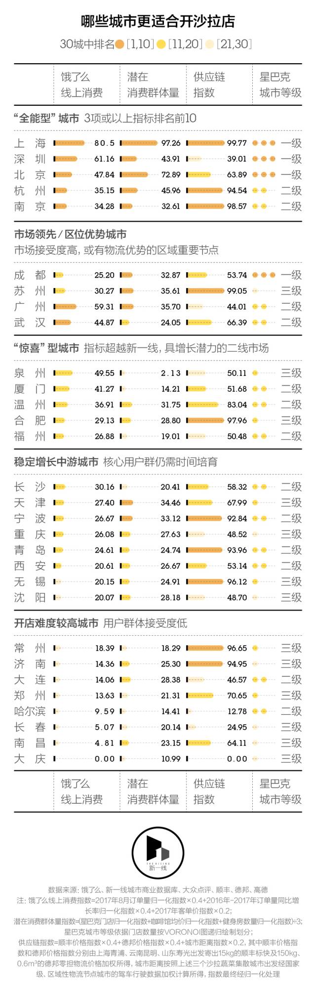 新一酱把每个城市的沙拉消费、健身房和咖啡店数量/均价、以及城市的物流状态、星巴克城市等级这四个指标综合了起来,判断哪些城市更适合开沙拉品牌店。