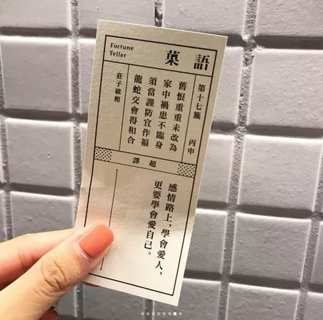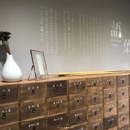 在店内一隅摆设了一座充满古朴气氛的签诗箱,诗签共分为人生、工作、学习、感情4种,可以任选其中一种抽签,呼应语菓的英文名称“Fortune Tellerr”。