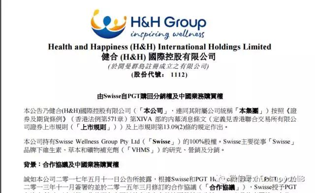 11月13日,健合集团发布公告,集团旗下由范冰冰代言的Swisse Wellness和PGT Healthcare宣布达成一项协议,包括将结束双方合作伙伴关系,并将全球所有地区的分销权和管理权全部归还Swisse。Swisse将回购根据2013年签署的合作协议所授予PGT的分销权,包括中国市场的选择权。