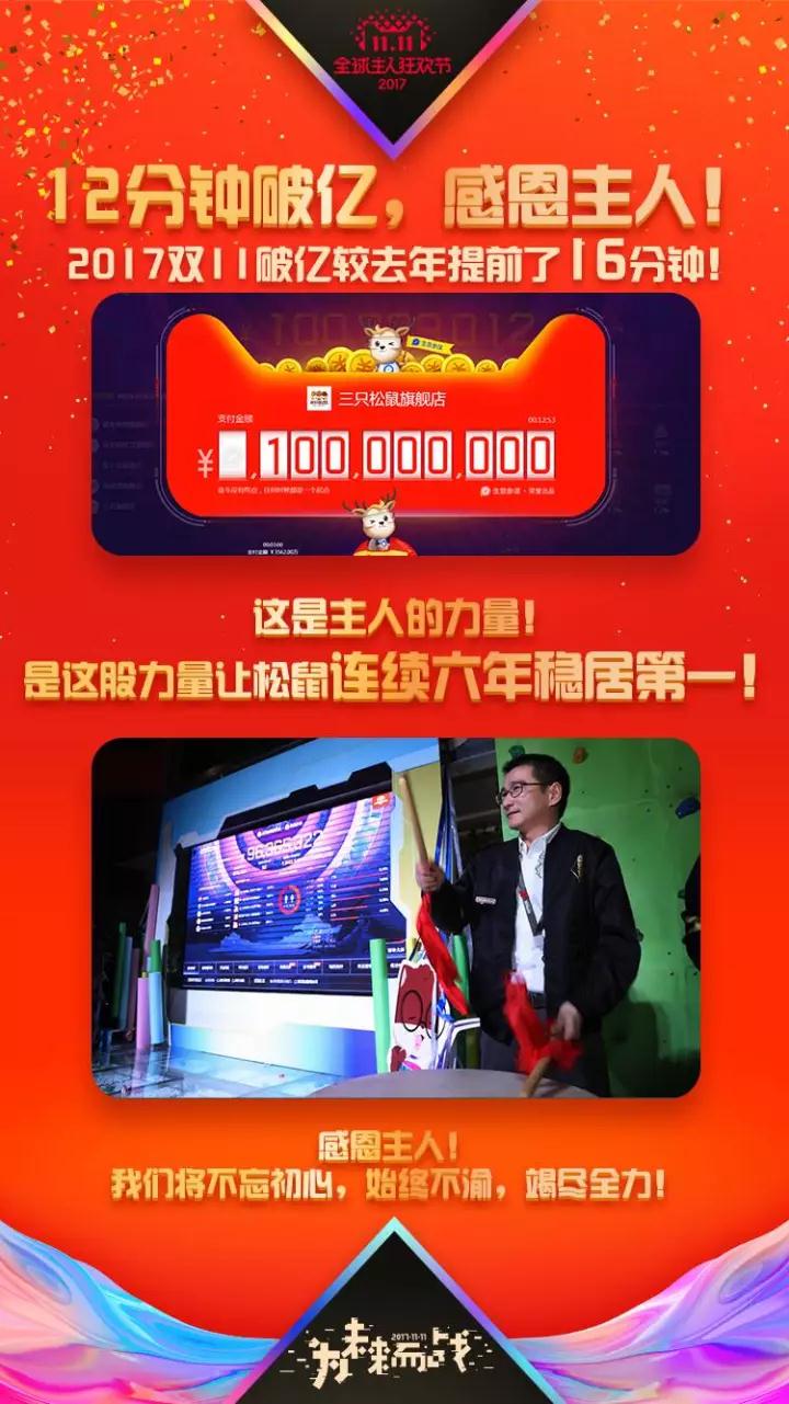 是的,那个屡创电商“奇迹”的三只松鼠今年依旧没有让我们失望!天猫单店销售额1个亿,三只松鼠只用了12分钟,较去年提前了16分钟!”