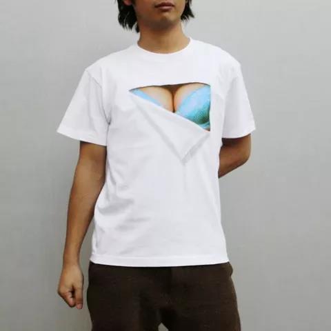 在致力于让一件白色T恤发挥最大视觉效用上,日本设计师做过不少尝试。比如为纸片女孩们设计的大胸爆杯T恤,不那么暴露的视觉错位T恤,以及由此延伸出的湿身T恤——看起来还是挺实用的。