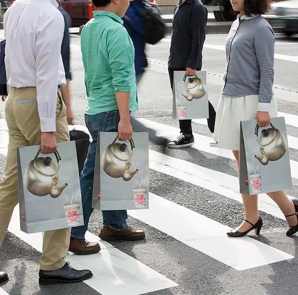 甚至有的时候,他们还会采纳“民间脑洞”——网友们自发向日清投稿,有趣的设计可能被采纳并商品化。这其中最有名的商品也与视觉错位有关——热水壶泡面纸袋,让你随时随地都在泡泡面。这款纸袋最早由一个泡面爱好者设计、并投稿在日清杯面的Facebook页面。因为人们反响太热烈,日清也正式把它推出作为官方周边,一个300日元(折合人民币约18元)。