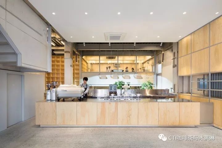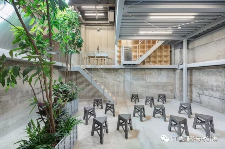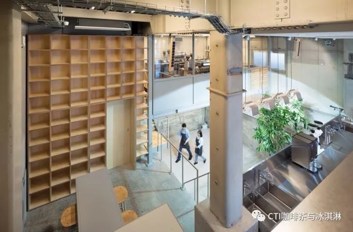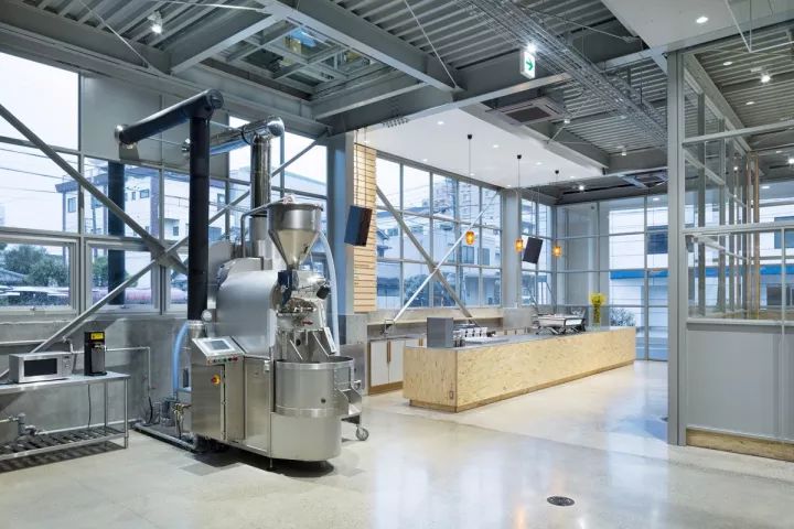 “这里原来是个电器厂,是个三层的钢筋结构建筑”。长坂先生把建筑改造成挑高的大型咖啡店,融合店员作业区和店舖于一体,为了充分利用店面,使用一眼望去相当透明的台阶式结构,把之前装货和卸货的区域改成公共空间”。