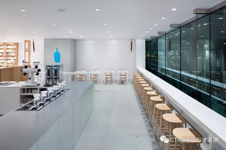 Blue Bottle在日本的第一家店,是将原址的旧仓库重新建造改装而成。设计师为原本缺少光线的仓库加入了大片落地窗与天窗,替室内迎来舒服的自然光,配上仓库本身的挑高设计,整个空间也就显得明亮宽敞了。