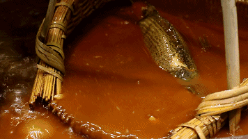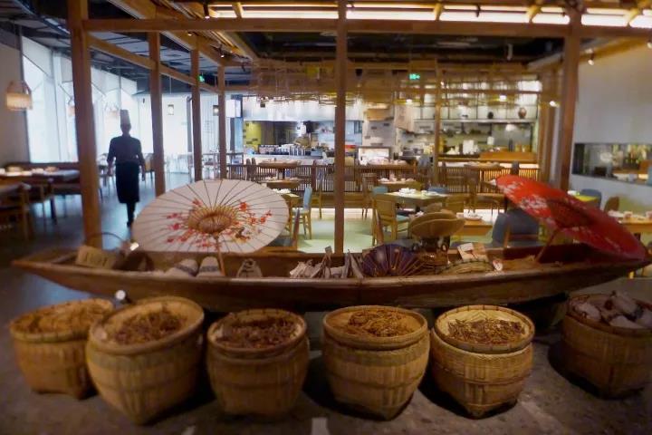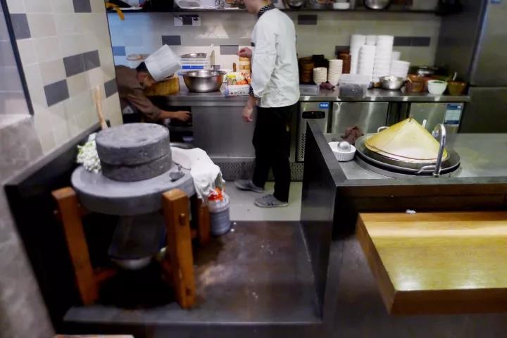 首先,顾客在 7 个档口可以看到各类小吃的现场制作,不管是档口的实际使用还是空间装饰上都可以见到大量的民间器物,比如簸箕、箩筐、石磨、酱缸等,它们提供了非常直观的现场感受。