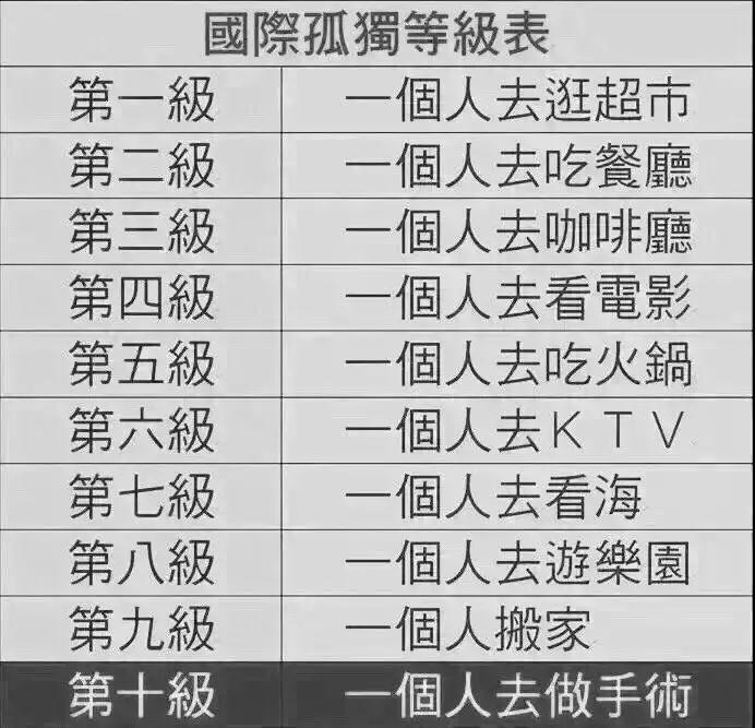 利用这样的调侃方式,将单身分为十级,单身人群自动入座,标榜单身级别。我见过一个十级的“单身狗”,上述的每一件事情都是自己去完成的,想去看海就收拾行囊自驾游,想吃火锅就自己到店用餐。其实不难发现,大家对单身的观念接受程度越来越高,不将就,保持单身慢慢成为一种趋势。