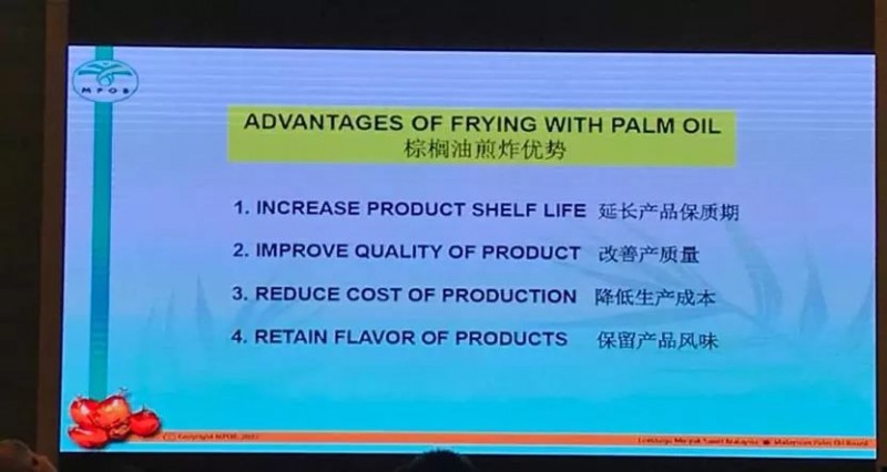 本次大会上,对多种煎炸用油脂,如葵花籽油、菜籽油、棕榈油都进行了分析讨论。来自马来西亚棕榈油总署(中国)的Ooi Cheng Keat总监表示,棕榈油拥有高营养价值、不含胆固醇、无反式脂肪酸、油质稳定等优势,综合来说可以作为一种理想的煎炸用油。