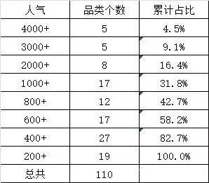 有人统计了翠华餐厅日月光广场店(上海)各个品类的人气数,总共有110个品类,人气最高达到7353,人气最低只有242,人气在2000以上的只有18个品类,人气在1000以上的品类只有35个。并且大约20个品类贡献了80%的收入。