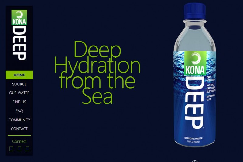 Kona Deep 的水源位于夏威夷科纳海洋表面以下3000英尺,为纯天然矿物质源,在处理过程中不含任何添加剂。 这家仅成立两年的公司表示,他们的水是天然电解质和矿物质的独特混合物,具有水合作用。Kona Deep 通过管道泵输送水源,通过反渗透将海水淡化, 保留天然矿物质和电解质,并将其装入瓶中。