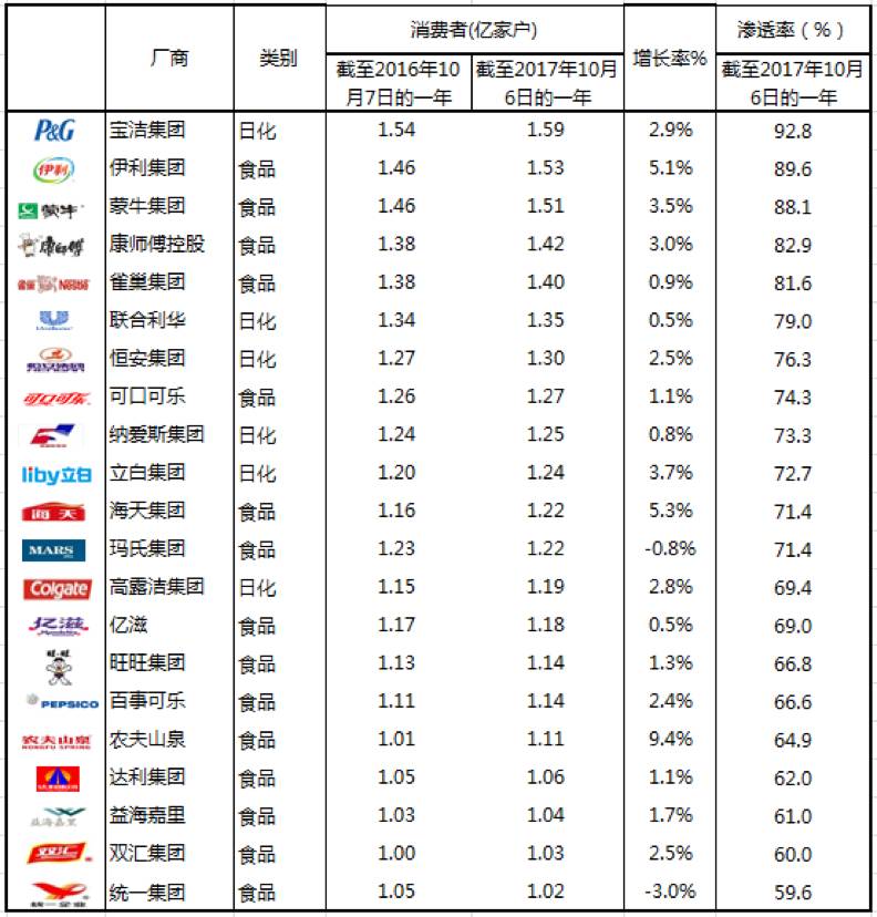 全球领先的消费者市场研究机构凯度消费者指数最新研究表明,截至2017年10月6日的52周,21家快速消费品企业拥有过亿购买城市家庭,其中宝洁,伊利和蒙牛的购买家庭数量超过1.5亿,居于领先的位置。这三家公司的城市家庭渗透率分别达到92.8%,89.6%和88.1%。从消费者规模的增长率来看,农夫山泉、海天和伊利是年度增长率最高的三家企业。