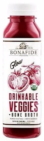 6.蔬菜骨头汤:美国Bonafide Provisions公司推出的该款产品含有机番茄、有机红甜菜、有机黄瓜、有机红洋葱、有机罗勒、凯尔特海盐和有机鸡骨汤等,声称有助于滋润皮肤,同时含有的维生素C 和抗氧化剂具有排毒和抗炎症的属性。每份中含6-11g的蛋白质,不含浓缩物、糖和防腐剂。每瓶的热量低于110卡路里。