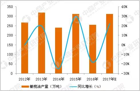 2016年,全球橄榄油产量为255万吨,同比下降18.27%;2017年,全球橄榄油产量预计达312万吨,同比增长22.35%。