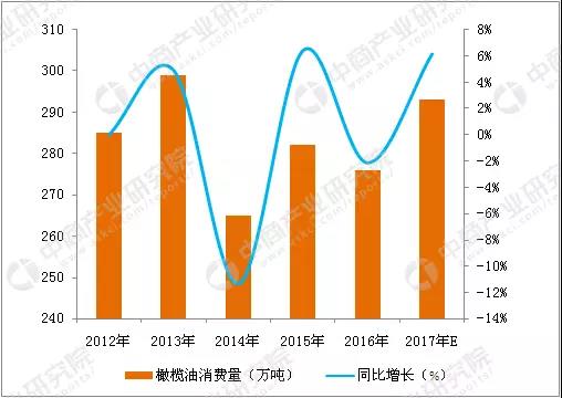 2016年,全球橄榄油消费量为276万吨,同比下降2.13%;2017年,全球橄榄油消费量预计达293万吨,同比增长6.16%。
