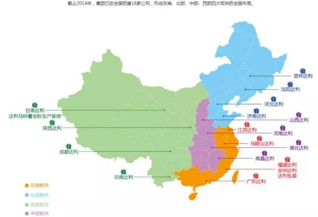 截至目前,达利园在全国16个省区建立18家子公司共30个食品、饮料生产基地,1个马铃薯全粉生产基地,1家包装彩印公司,同时,集团构建享誉业界的黄金销售渠道,组成了覆盖全国的营销网络。
