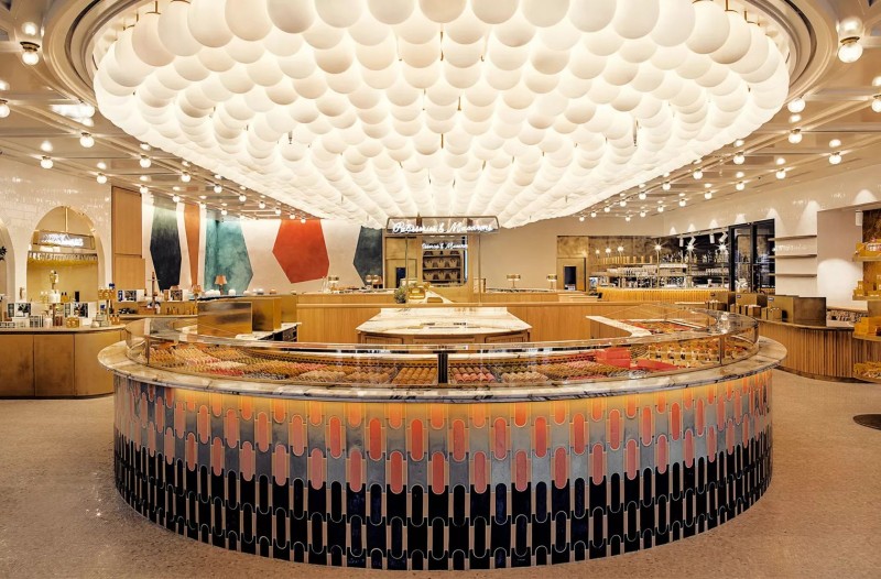欧舒丹在门店内的周边展示品牌的历史、产品及其主要成分(马鞭草,杏仁和牛油树),同时还陈列了圣诞礼盒,圣诞礼盒的销售额约通常会占到品牌占全年总销售额的25%;而在门店的中心,放置着Pierre Hermé 制作的高级甜品,有马卡龙,法式蛋糕和其他甜点。消费者可以在这里享用早餐、午餐以及晚餐,或者在 Le Barista 区品尝咖啡或鸡尾酒。