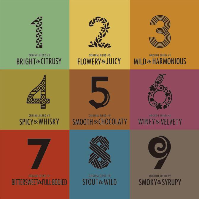 诸如1号最浅款滑顺明亮易入口,2号是Flowery&Juicy,4号是香料与威士忌融合的异国风味;7号是苦涩与蜜糖甘醇交加的柔顺口感。1-4号比较适合初入咖啡的爱好者的口味。7-9烘焙度越来越深,9号则是最深的一款有待你的挑战。根据不同的心情,也能有不同的咖啡口味来选择。