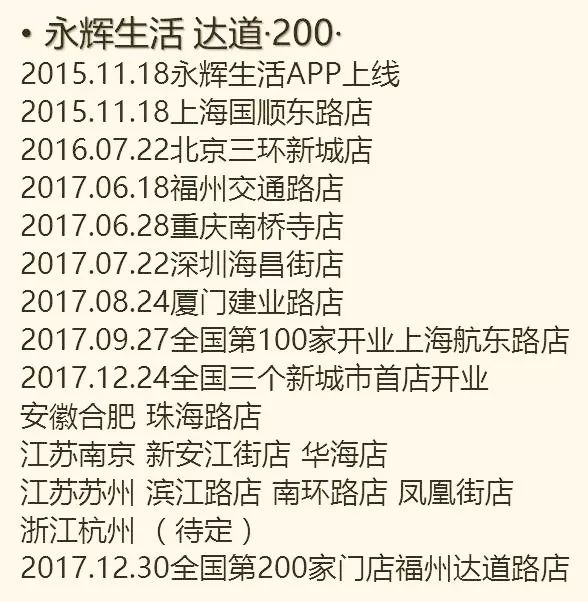 永辉生活在2017年9月27日开出100家门店,半年内使门店数完成两倍增长。本月30日,第200家永辉生活福州达道路店即将落地,开店增速进一步提升。