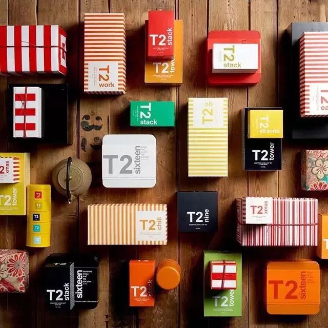 黑色+橙色或黑色+其他明亮颜色,是T2所打造产品包装的经典配色,这也与T2所打造的全黑氛围形成鲜明的对比,与其品牌形象相一致。