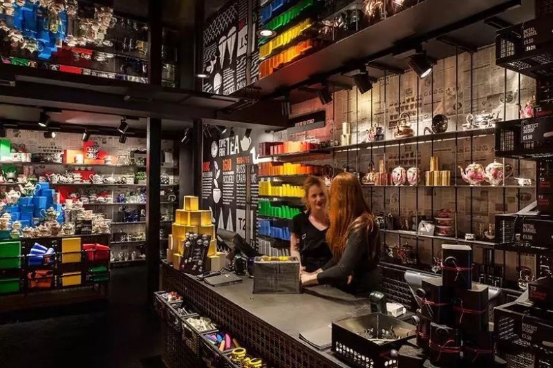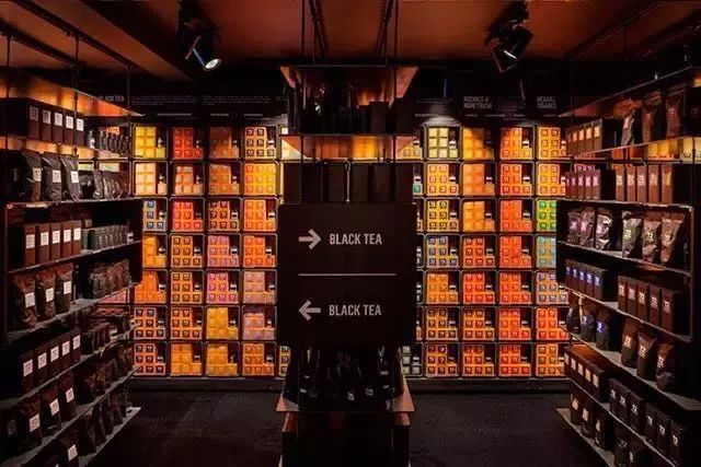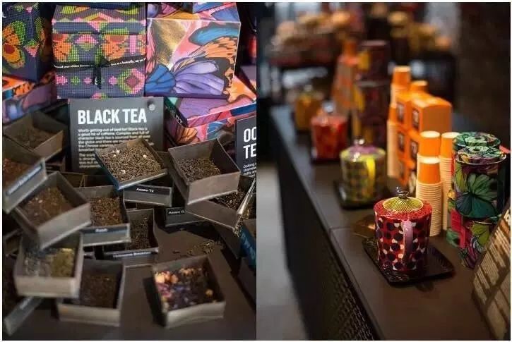 砌墙的茶叶不仅是产品,还有室内装饰的作用,鲜艳的色彩点亮了整间店铺,使之更加活泼,而不是那种拒人千里的“酷”,使得顾客沉浸于世界茶文化的海