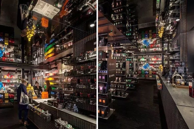货架、墙面、地面、天花板全是黑色,并将所使用的原材料和框架结构暴露在外,呈现出最本真的状态,让人感觉有点像创意十足的潮牌店。
