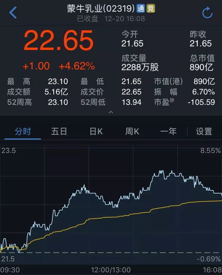 受此利好消息刺激,在香港上市的蒙牛乳业股价今天最高上涨6.7%至23.1港元,近一年来市值首次突破900亿港元。