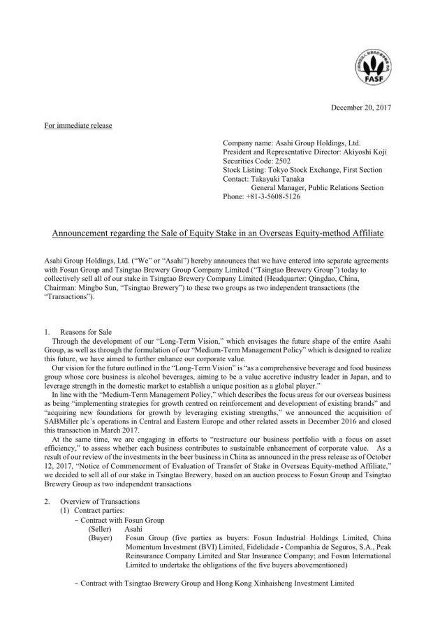 “根据2017年10月12日新闻稿公布的对中国啤酒业务投资情况的审查,我们决定出售在青岛啤酒的全部股权,分别与复星集团和青岛啤酒集团进行两项独立交易。”朝日在公告中表示。
