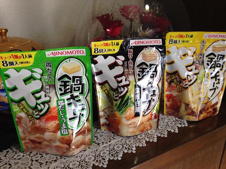 目前味之素的火锅汤块有咸味鸡肉高汤、浓厚白汤、鸡肉干贝酱油、十种野菜锅、辣味泡菜、猪骨味增、豆乳锅和汤咖喱等八种口味,选择性非常丰富。