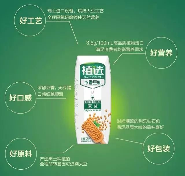 此外,在原料甄选方面,植选专注从田头到舌尖的品质管控,原料严选黑土种植区,全程非转基因可追溯大豆,确保每一颗大豆的品质安全。天然、无负担的优质植物蛋白营养,拥有3.6g/100ml的蛋白含量远高于市面一般豆奶产品,再配上精巧时尚的利乐钻包装,伊利植选期寄用五好产品力快速撬动市场。