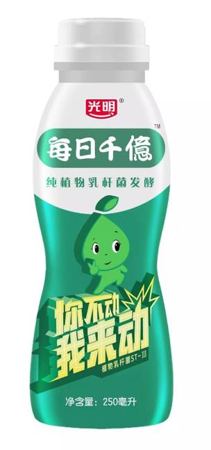近日,光明乳业推出一款“每日千亿”活性乳酸菌饮品,每瓶包含1000亿活菌,选用专利菌种植物乳杆菌ST-Ⅲ进行发酵,在肠道内存活率高,为人体补充益生菌,绿色瓶身,热带水果口味,这款乳酸菌饮品以“你不动我来动”的宣传口号来宣称肠道健康的定位和属性。