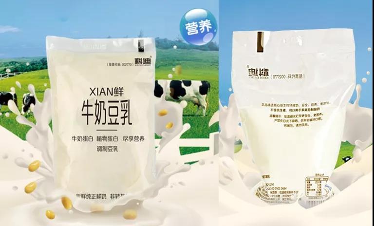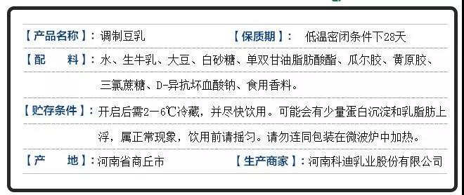 “科迪”豆浆牛奶则主打“双重营养、双重蛋白”,企业将这款产品定义为配置型含乳饮料。主要配料为水、生牛乳、豆浆粉,其中豆浆粉也是非转基因大豆制品。常温密闭储存即可,保质期29天。