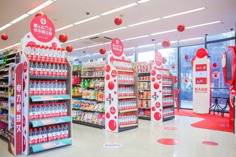 而在地面渠道上,农夫山泉也别开生面的将店面门头装饰一新,并在上海等地举办“快闪”活动,号召公众的共同慈善秀。