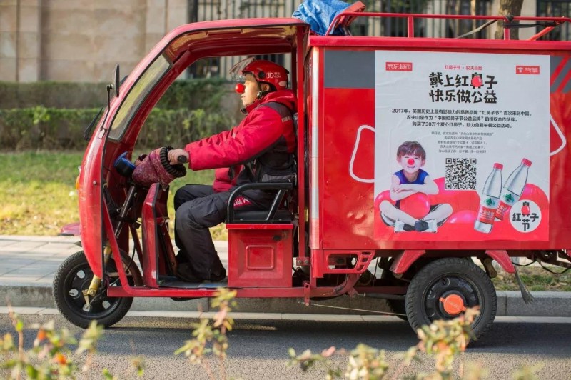 同时,农夫山泉也发起更多的跨界玩法。最近,如果你在杭州,就会发现有一群红鼻子小哥穿梭在城市之间——这是农夫山泉与京东物流发起的一次快乐接力。