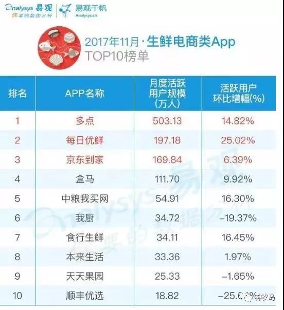 首先来看一下国内最具权威的第三方监测机构易观千帆发布的《2017年最新生鲜电商App Top 10排行榜》,排名依据生鲜电商11月月度活跃用户量。多点Dmall以月度活跃用户503.13万人位居榜首,每日优鲜、京东到家、盒马鲜生分列二、三、四位。