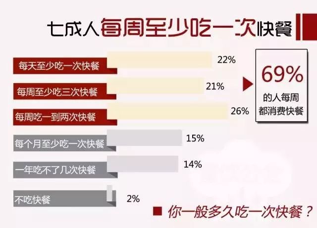 在我们的调查中,有22%的人表示他们每天至少吃一顿快餐,而每周吃三次快餐和每周吃一到两顿快餐的人分别占21%和26%。也就是说,69%的人每周至少会吃一次快餐。