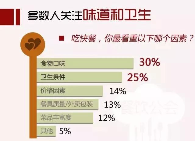 选择快餐时最关注的因素中,30%的人选择了口味,25%的人最注重的是卫生条件,只有14%的人首先关注价格问题,这和关注餐具质量、外卖包装这些视觉化体验的人比例差不多。 另外,有12%的表示最喜欢“选择多,经常出新品”的快餐。对于通过“单品打爆”的快餐店来说,在找准主营品类的同时,定期优化和更新菜品也是不可避免的。