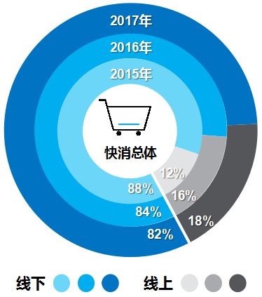 虽然线上销售近几年增长速度迅猛,但线下销售占比之大仍不容小觑。截至2017年七月底,快消线下销售额仍占总体销售额82%。即使对电子商务平台销售较为依赖的婴儿纸尿布品类,2017年的线上销量也仅与线下销量平分秋色。冲动型消费类品类如饮料的线上销量相对于线下更是微乎其微。