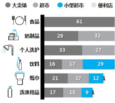 从产品品类看,仅通过产品组合优化,食品超级品类的增长机会巨大;从渠道看,小型超市在六个超级品类中共有1440亿人民币的销售增长空间(图中蓝色填充区域数字之和),店虽小,机会大,同样非常值得关注。