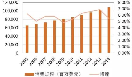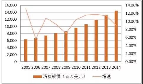 全球营养保健食品行业总体保持平稳增长,其中膳食营养补充剂消费市场规模2014年达到1,085.99亿美元。全球膳食营养补充剂销售总额变动趋势如下图: