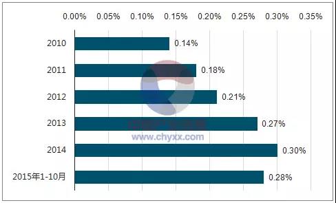 2010-2015年中国营养保健食品行业规模以上企业销售收入在GDP中占比统计: