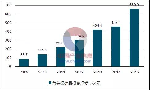 2009年我国营养保健品的投资规模为88.7亿元,2015年营养保健品投资规模为660.9亿元。
