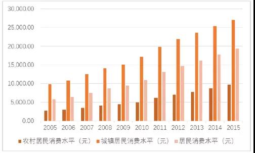 近几年,我国居民人均消费水平不断提升,2005-2015年年均名义复合增长率为12.84%。伴随着居民消费水平的提高,我国居民消费者在满足基本生活需要的基础上,增加对营养保健食品的需求。2005-2015年,我国居民消费水平、农村居民消费水平及城镇居民消费水平增长趋势如下图所示: