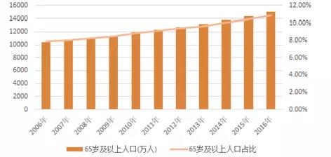2006年-2016年,我国65岁及以上人口数量、65岁及以上人口占总人口比例如下图所示: