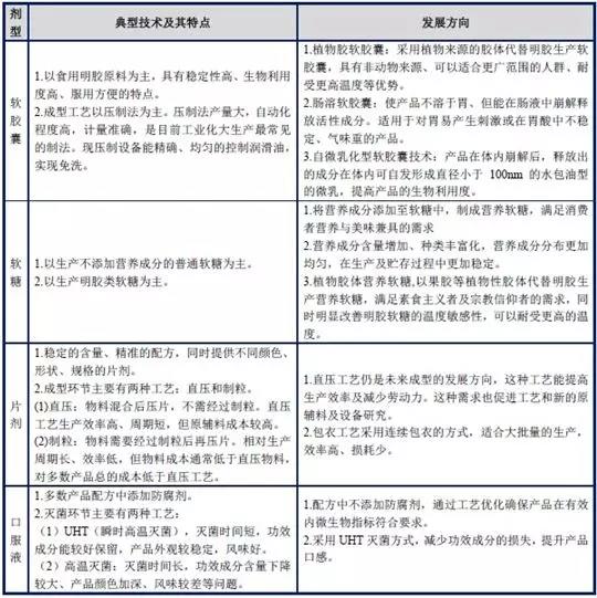 营养保健食品企业根据功效成分的特性配合制剂工艺,持续研究,不断优化产品工艺,尽可能减少功效成分的损失,同时保证产品功效成分的稳定性。国内少数竞争实力较强的企业开始逐渐通过采取新的技术和工艺方法、引进国外先进的营养保健食品生产设备提高生产工艺水平,提高企业和产品的竞争力。