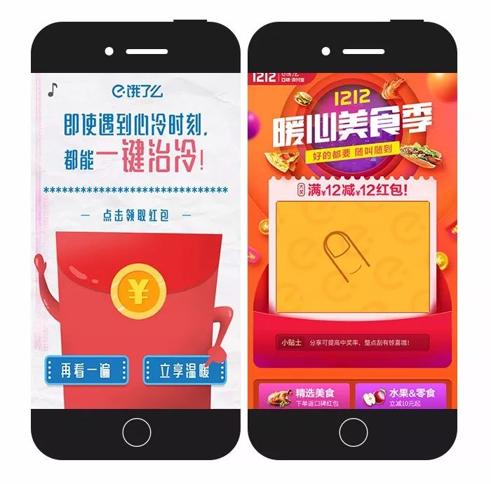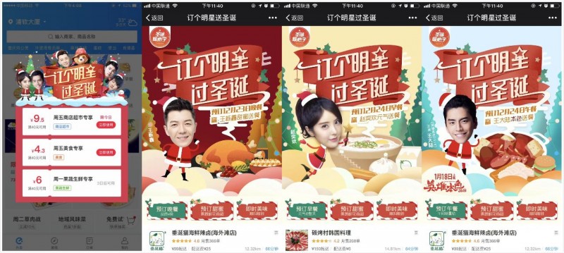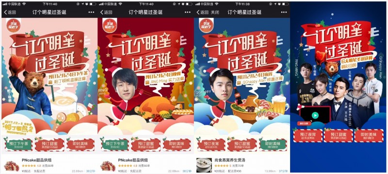 晒出送餐明星阵容后,配合着站外的social传播,饿了么在站内同样设置了明星送餐的主会场,不同时段里不同明星的定制页面轮番上阵,共同营造欢乐的圣诞氛围,成功吸引了众多用户纷纷前去APP活动专区参与活动下单。