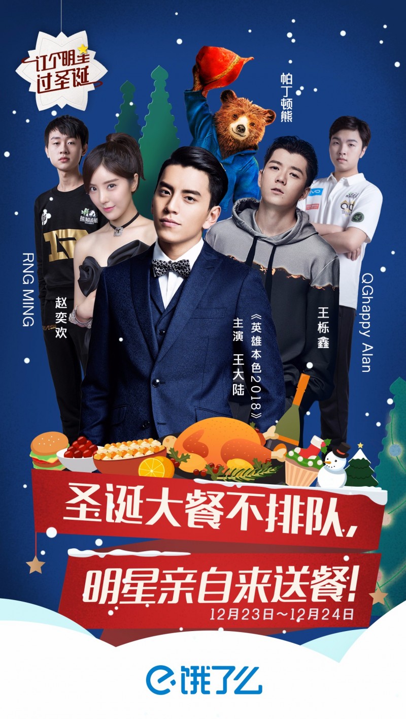 订个明星过圣诞!饿了么在圣诞季派出了当红鲜肉王大陆、新锐演员赵奕欢、帅气暖男王栎鑫、电竞英雄RNG MING、QGhappy Alan以及英伦萌熊帕丁顿熊来亲自为用户送餐,以此引发了明星粉丝及电竞爱好者的大量关注。