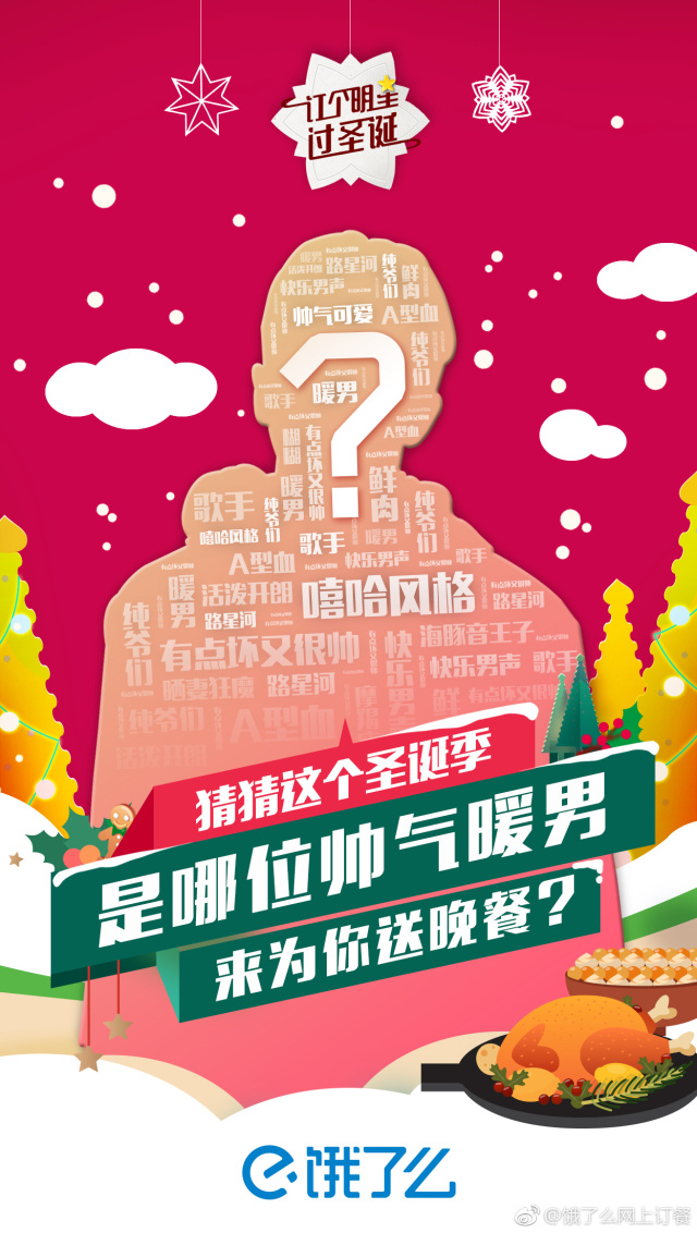 饿了么官方微博通过一组极具趣味性的明星悬念海报来向大家公布圣诞季“明星亲自为你送餐”这一令人兴奋的消息,并吸引了众多用户围观并猜测。